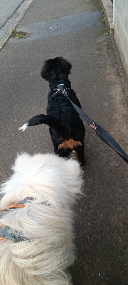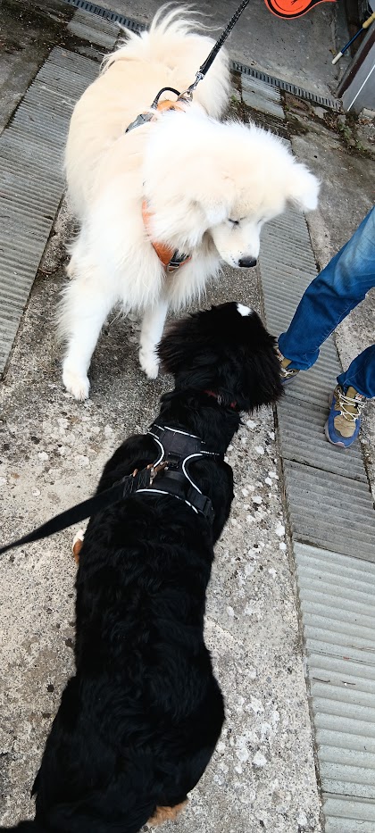 Là voilà, waouh pleine de poils bien blanc qu’elle entretien dit donc! Snif snif elle est chouette, maman me dit qu’elle a l’age de Sunny, elle s’appelle Dawa. On fait un petit bout de balade ensemble, elle est calme et sympa, j’aime bien :)