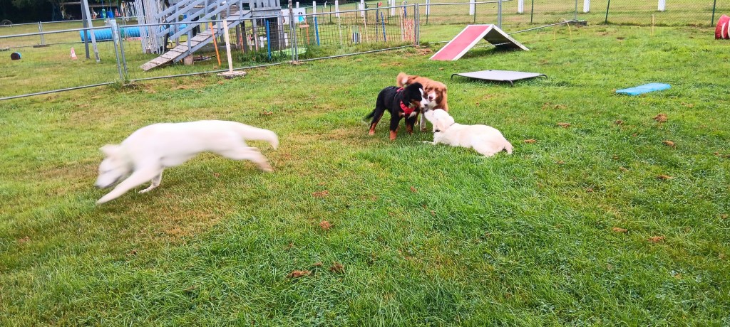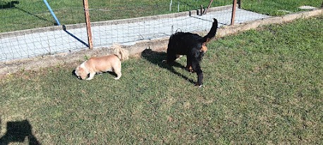 Durant le cours le Mr sans chien m’a fait faire un truc bizarre… j’ai été attachée avec ma laisse à ma copine la Chowchow, et puis sa maman et la mienne sont parties au bout du terrain, biensur quand le Mr m’a lâchée et dit va chez maman, j’ai couru la rejoindre … sauf que … ma copine elle court pas beaucoup