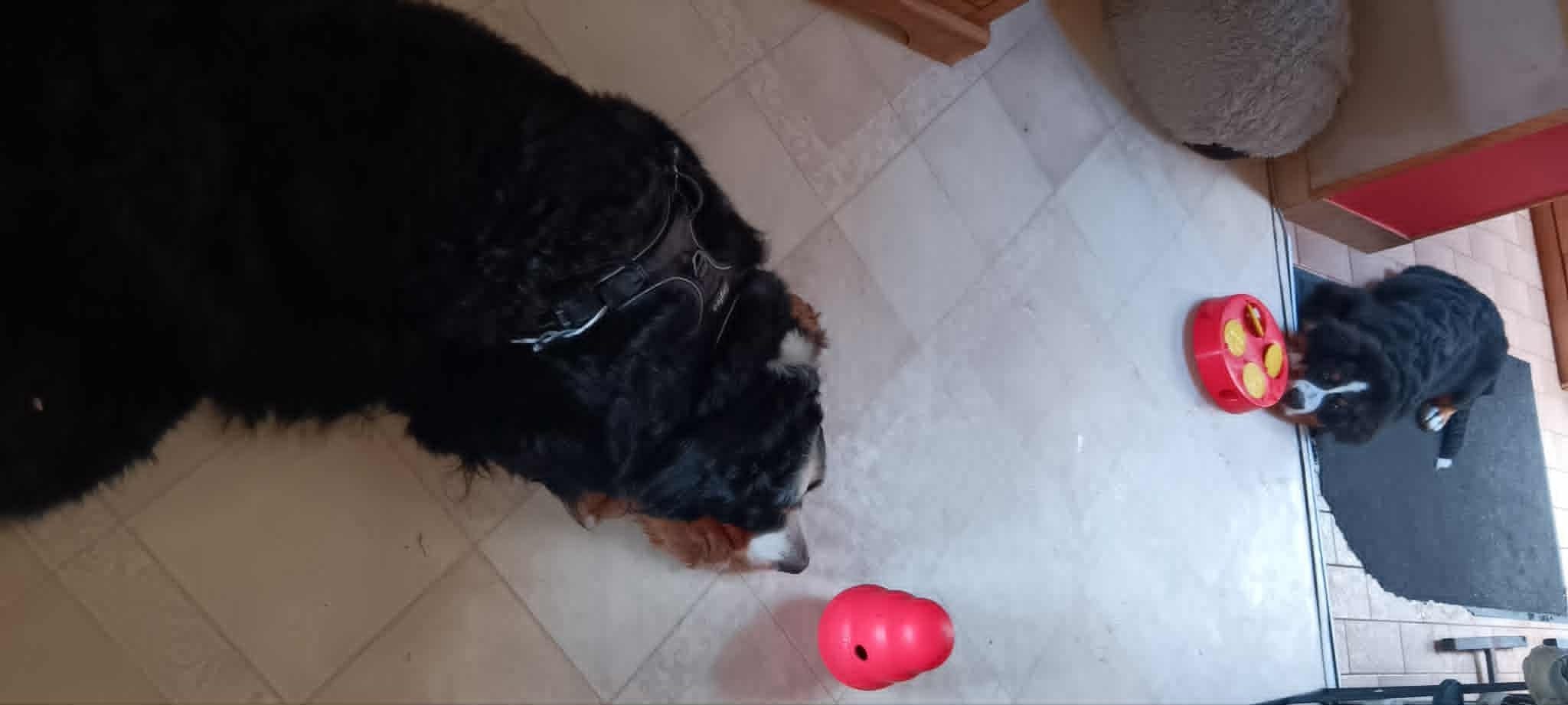 - Ballons distributeurs ou puzzle feeders : la nourriture sort quand le chien manipule l’objet.